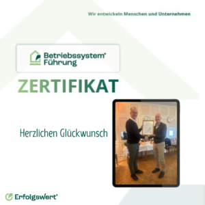 Mit Stolz überreichte Ralf Seveneick im Namen der ErfolgsWert GmbH das Zertifikat „Betriebssystem Führung“ an einen echten Vorreiter der Wohnungswirtschaft: